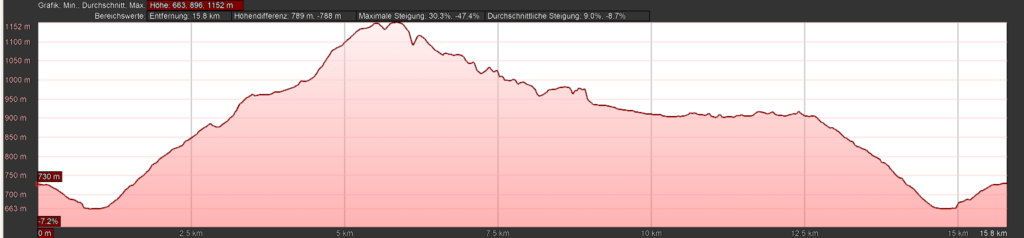 Strecke: 16.3kmMax. Steigung: 30.3%Niedrigster punkt: 663mHöchster Punkt: 1261m